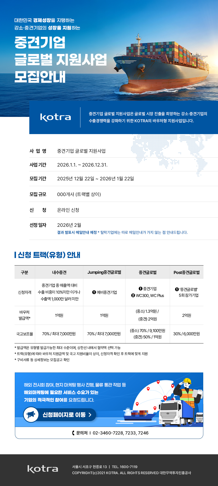 대한무역투자진흥공사(KOTRA)에서는 해외 진출에 관심 있는 중견기업을 대상으로 "2026년 중견기업 글로벌 지원사업" 참여기업을 모집합니다.
