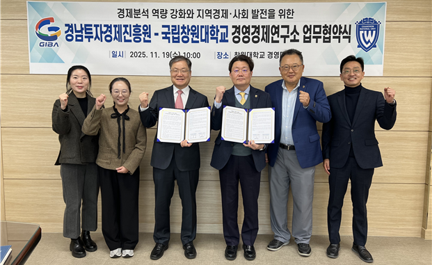 (재)경남투자경제진흥원(원장 오재호)과 창원대학교 경영경제연구소(소장 신성식)는 2025년 11월 19일 창원대학교에서 지역경제 발전과 산업 경쟁력 강화를 위한 업무협약을 체결했다.