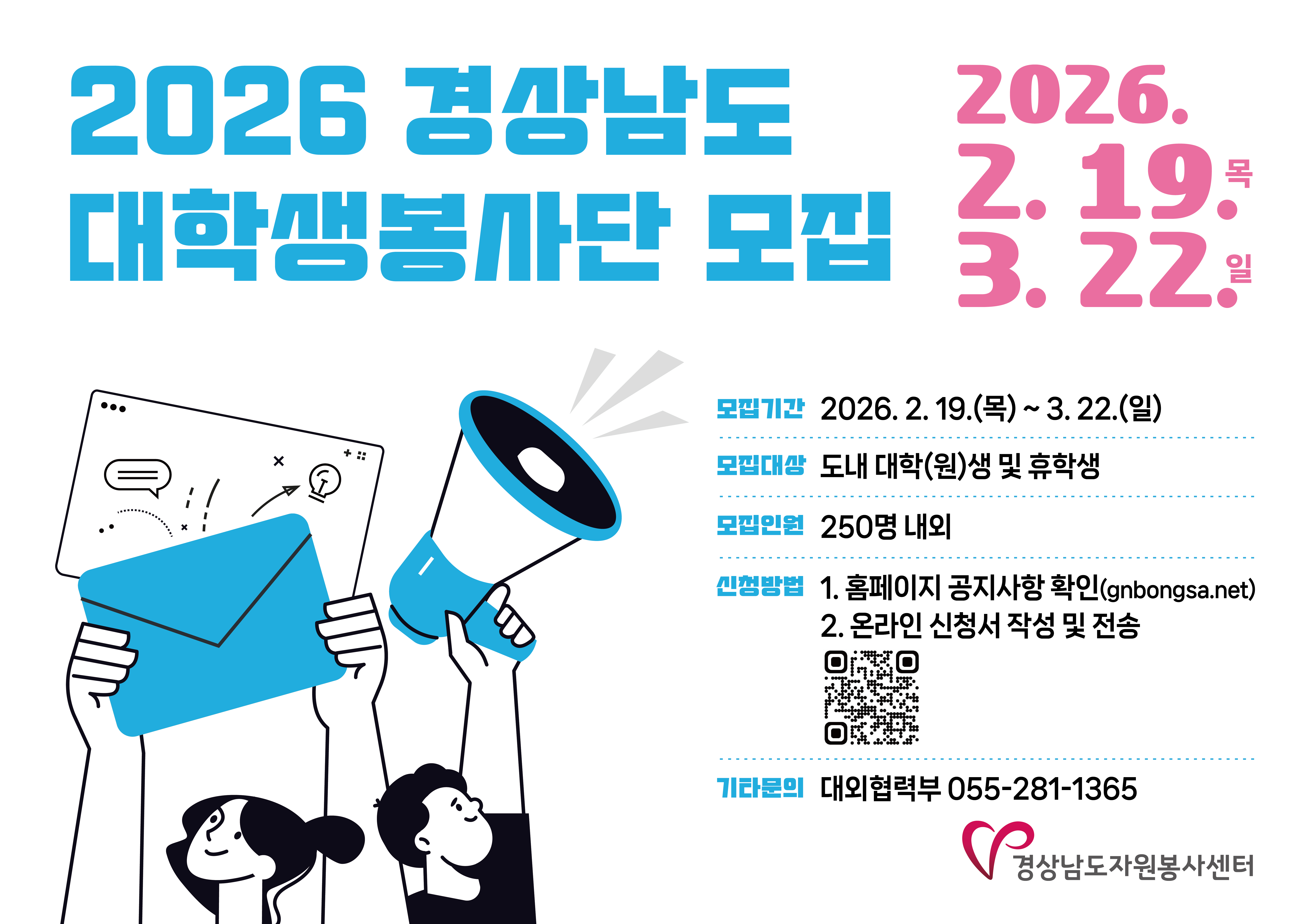 이와 관련하여 대학생들이 다양한 자원봉사활동을 경험할 수 있도록 제15기 '2026 경상남도대학생봉사단'를 모집하오니 경상남도 대학생 여러분의 많은 관심 부탁드립니다.